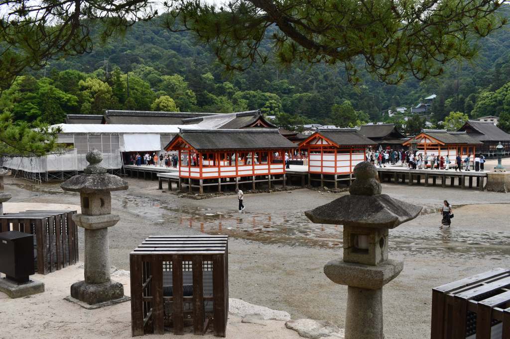 Behind the gate is the Itsukushima Shrine. I visited while it was under construction, but as the tide rises, it fills in the moors surrounding it.